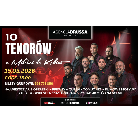 10 Tenorów – Z miłości do kobiet 💕 W marcu 10 Tenorów powracają z nowym, pełnym emocji programem! Tym razem oddają hołd kobiecości i miłości – w wyjątkowym koncercie, który łączy pasję, humor i wzruszenie. Usłyszysz najpiękniejsze utwory o miłości – od klasyki operowej i musicalowej po znane przeboje w nowych aranżacjach. Dziesięć potężnych głosów, niezwykła energia i romantyczna atmosfera – to będzie wieczór, którego nie zapomnisz!